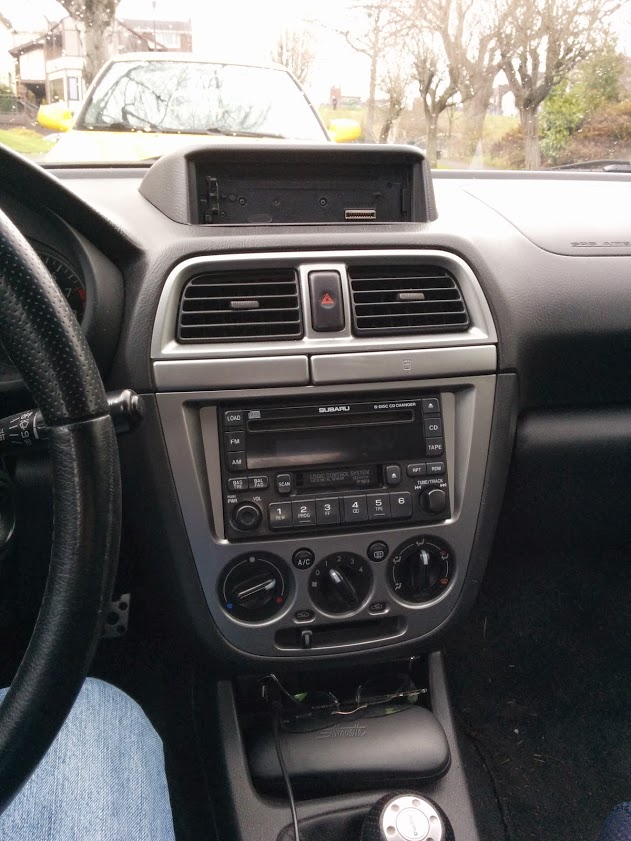 I created a façade which obscures the tablet and makes it look like I still have the original stock 6-CD changing, cassette-playing head unit installed. To do this, I removed the front panel from the stock head unit and cut away material on its sides to allow it to fit into place on top of the tablet. It doesn’t look exactly the same as a normal 2002 Subaru stock head unit, but it fits well and it’s close enough that any thief peeking through the window will clearly see a cassette slot and (hopefully) move on to the next car rather than trying to break into mine.