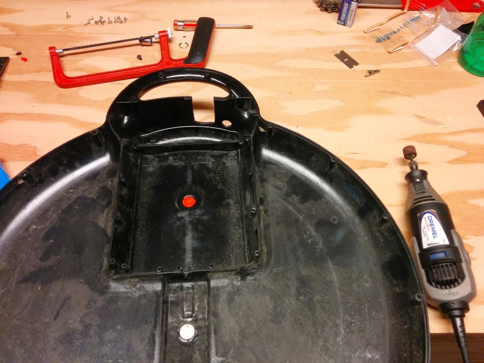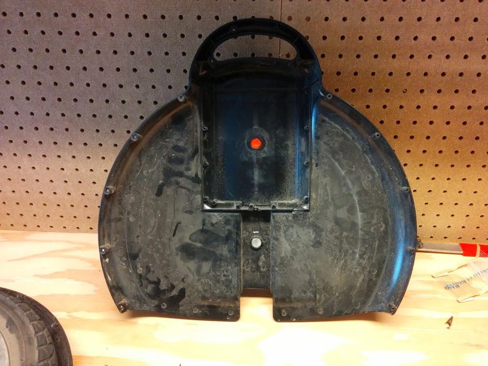 The electronics/battery cover can be removed from the housing by removing about a dozen small screws around its rim. Once this is off, the battery and a circuit board are exposed, and you can fully separate that half of the housing from the Solowheel. This makes it easy to drill/saw that half of the housing for modifications.