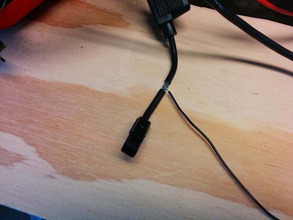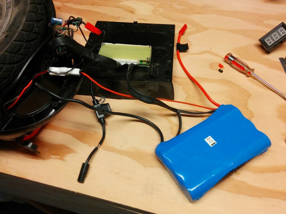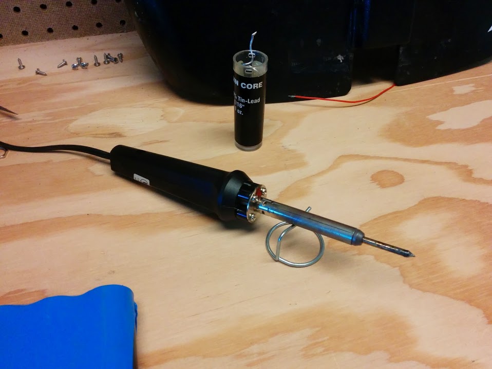 I pulled a couple of wires out of my box of electrical/computer junk which originally came from a computer fan and used them to splice my button and voltmeter into place. This involved a soldering iron and a very heavy dose of being careful about the fact that you’re handling live wires with a voltage of 50 to 60 V DC and there’s a lot of energy stored in those batteries.