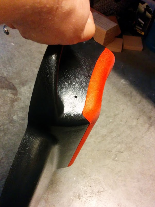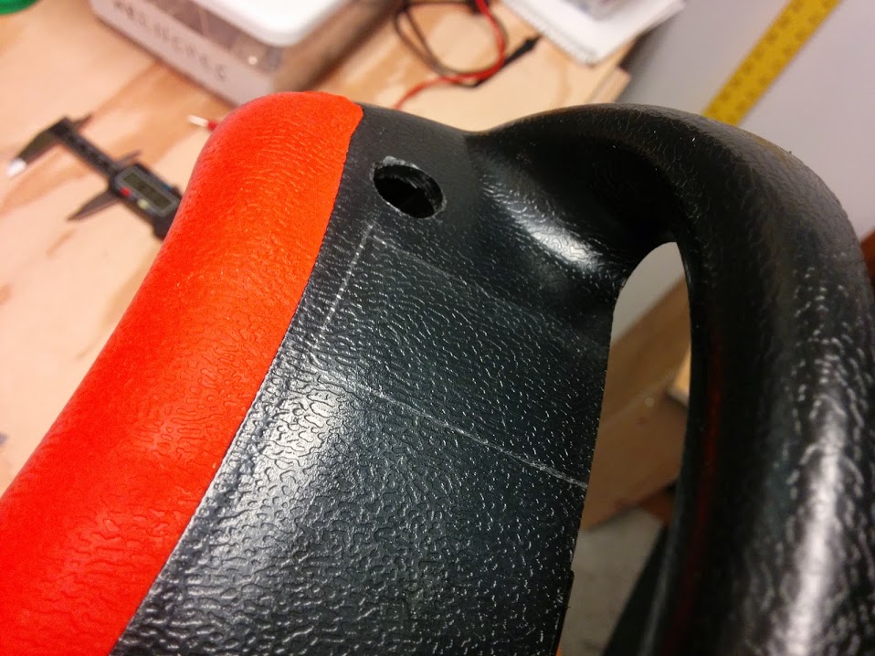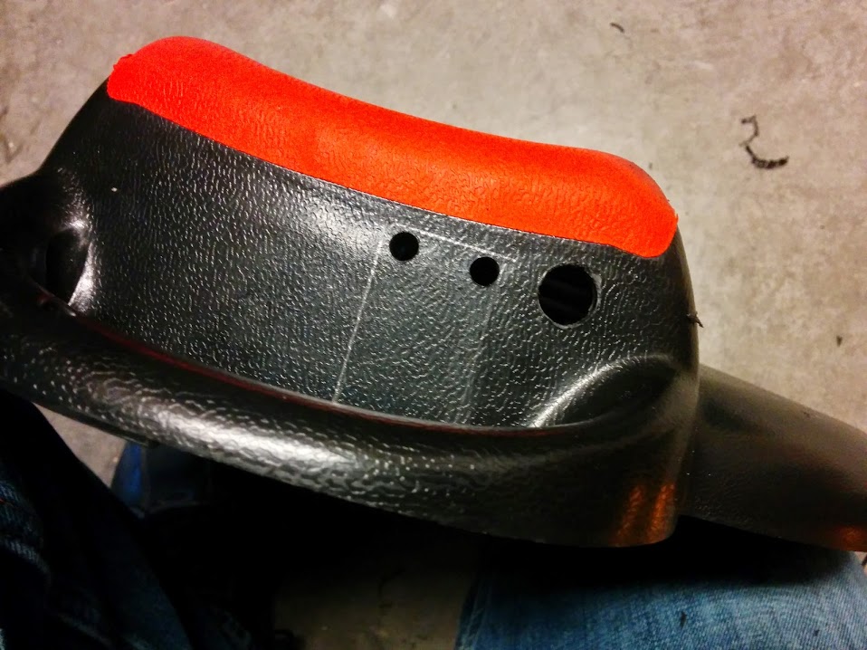With the housing separated from the rest of the Solowheel, I started cutting it. First, I drilled a pilot hole for the button, and then drilled it out with a 1/2″ drill bit. I kind of hacked up the case in this process. It’s tough to drill a ~13 mm hole in a piece of plastic only ~2 mm thick. But in the end, it came out looking alright.