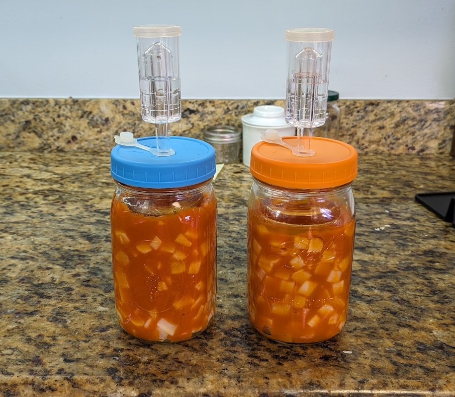 I use a fermentation kit like this one that’s designed for wide mouth jars. I spray the lid, gaskets, airlock parts, and weight with vinegar before use to sanitize them. (After each use, I run all of the individual pieces through the dishwasher before putting them back into storage.)