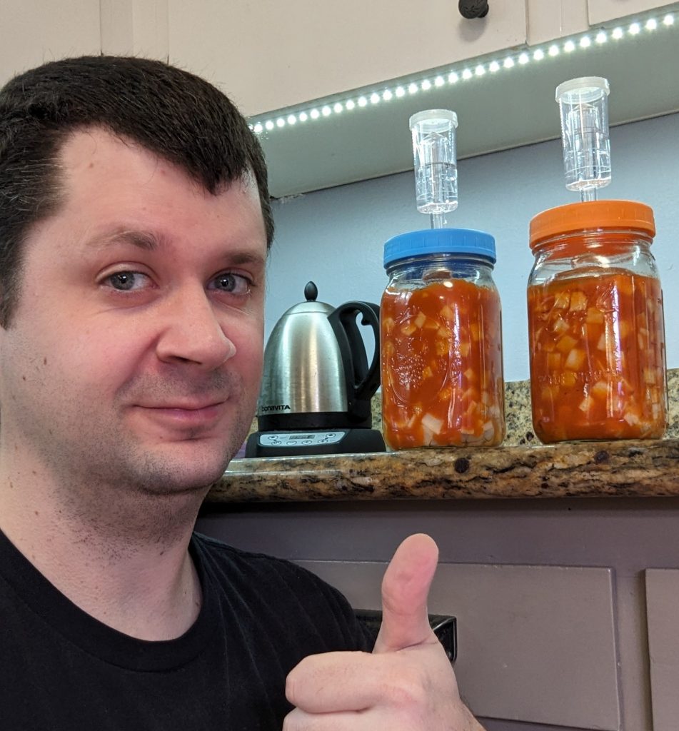 I put the glass weight on top of the mixture in the jar. If there is any sauce on the rim of the jar, I wipe it clean with a clean paper towel that’s been wetted with vinegar. Then I attach the lid. I fill the airlock with vinegar and install it. Finally, I put the jar in a cool dark place to ferment. I have done this in a cabinet inside my house before, which is air-conditioned. These days, I prefer to use my fermentation fridge, which is just a super cheap fridge I bought second-hand that I have fitted with an Inkbird brand external temperature controller. I will typically set it somewhere around 55 F (13 C) when I’m using it for active fermentation.